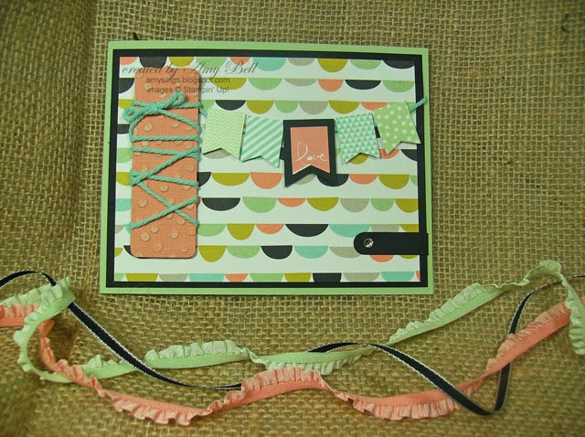We'll be making this card at Club tonight! It's inspired by Becky Jensen's card here. It features several Sale-a-bration products: Sweet Sorbet Designer Series Paper, Sweet Sorbet Accessory Pack (twine), Decorative Dots embossing folder, Banner Blast stamp set, and Banner punch. Time is running out to get your Sale-a-bration products! Be sure to place your $50 order and get your favorites FREE before they're gone on March 31!